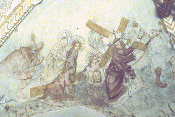 Danish Church ArtThree Motifs of the PassionJames Mills VERNICLE - VERONICA'S VEIL Vestervig. c.1475. (M-K 28-083.) Vernicle. South sect. Detail. Viskinge. c.1425. (M-K 29-011.) Carrying the cross. Sect 1, east arch. Far left, man with shovel. Left, two figures with nimbi. Simon of Cyrene helps carry the cross. Veronica with vernicle. Christ, with cross nimbus, carrying the cross. Center right, soldier with animal face pulls at hair and beard of Christ. Executioner leads Christ by means of rope tied around his waist. Raaby. c.1500. (M-K 20-080.) . St. Veronica. Choir, west wall. Veronica's veil. Head of Christ, with crown of thorns, on cloth. 0THER IMAGES IN THE MILLS KRONBORG COLLECTION Vestervig. c.1475. 28-82. Vernicle. South sect. NO IMAGES IN DANMARKS KIRKER |